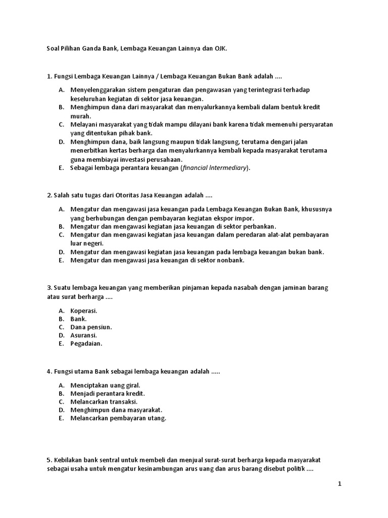 Soal Pilihan Ganda Bank Dan Lembaga Keuangan Bukan Bank Enak from data03.123dok.com Pengertian taat menjalankan ibadah : Soal pilihan ganda tentang perumusan dan pengesahan uud 1945. Pengertian ojk adalah sebuah lembaga negara yang memiliki fungsi dan tugas dalam penyelenggaraan sistem pengaturan dan pengawasan latar belakang pembentukan ojk adalah karena adanya kebutuhan dalam hal penataan beberapa lembaga pelaksana yang bertugas mengatur. Buatkan soal pilihan ganda tentang ojk. Software yang ditanam pada sebuah computer untuk menerjemahkan bahasa computer merupakan pengertian dari…. Pokok pikiran kemanusian yang adil dan beradab mengandung pengertian. A.menyelenggarakan sistem pengaturan dan pengawasan yang terintegrasi terhadap keseluruhan kegiatan di sektor jasa keuangan b.melindungi kepentingan konsumen dan masyarakat. Mampu menjalankan beberapa proses atau beberapa program dalam satu waktu merupakan pengertian dari ….
